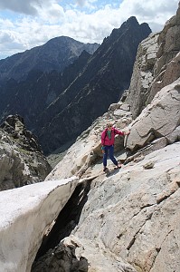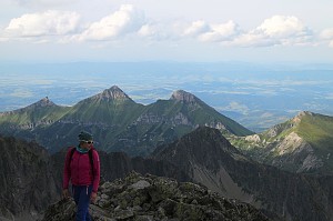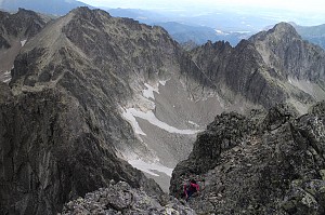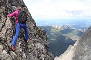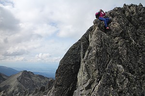 Trochę górołazikowania w rejonie Łomnicy. Podejście Klimkowym Żlebem i jego odnogą na Wyżnią Poślednią Przełączkę (fragment Jordanki). Stąd granią przez Klimkową Przełęcz na Durny (miejsca II) i na Mały Durny. 18.08.2014, J. Stępińska, P. Orawiec
