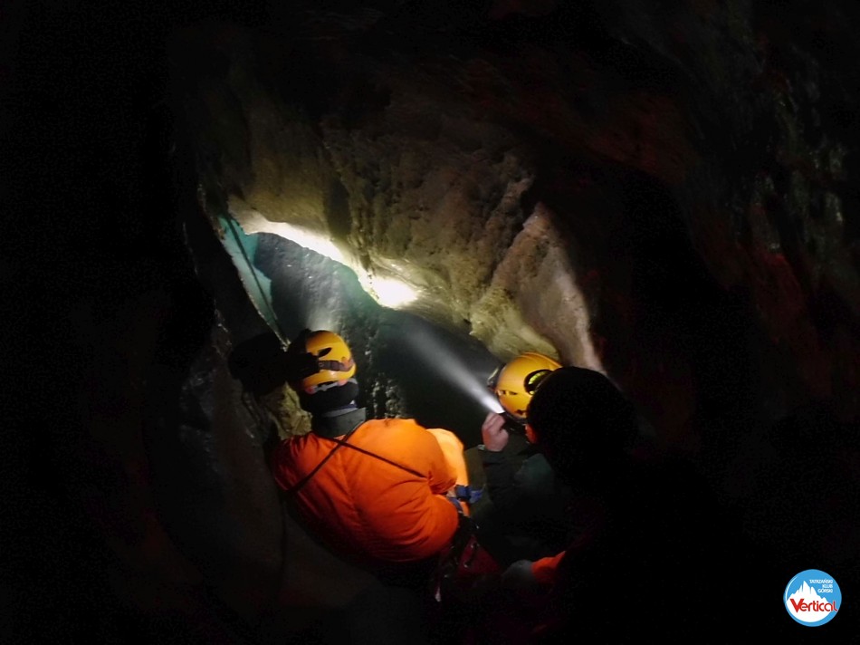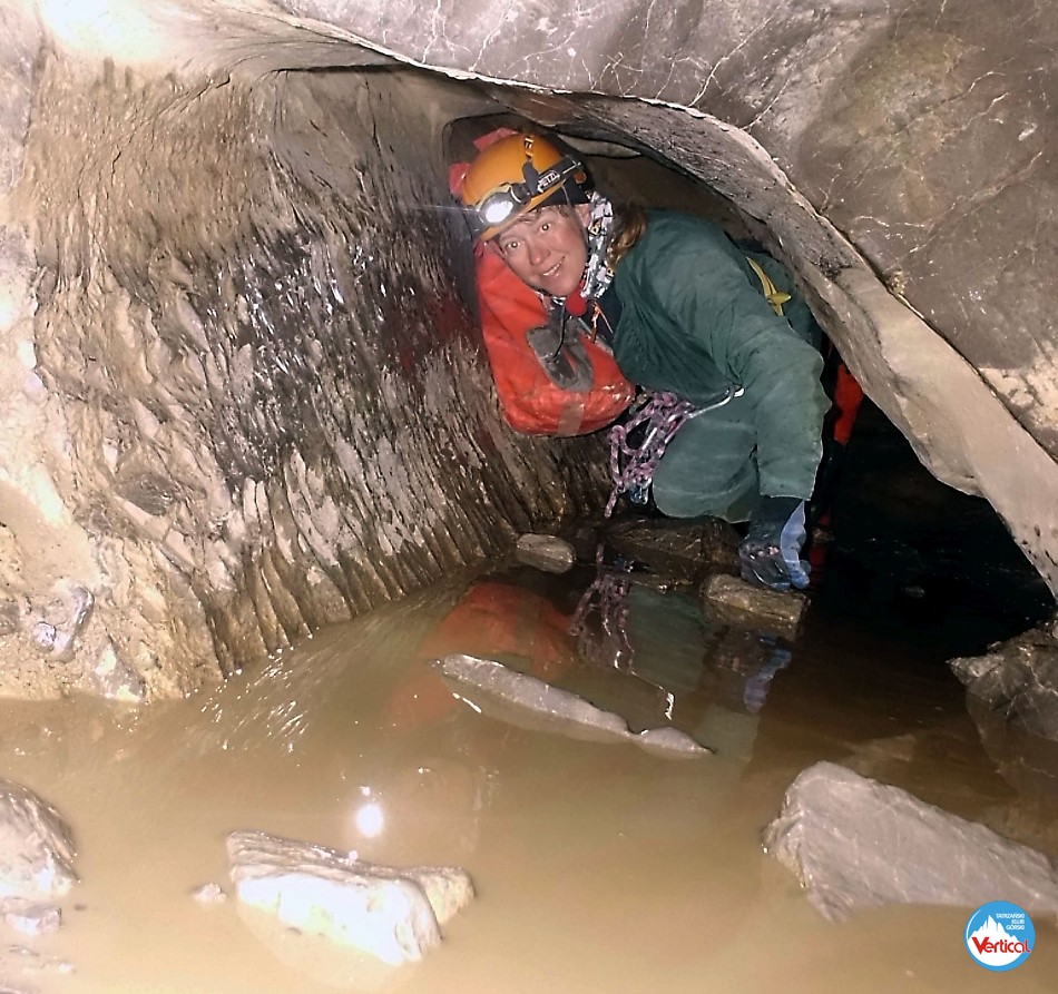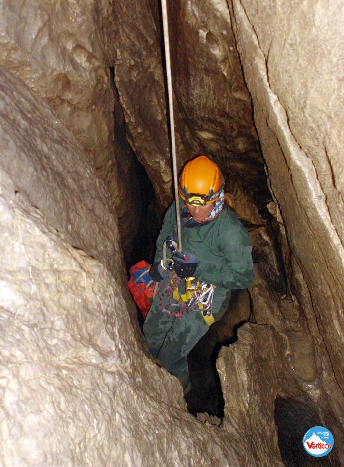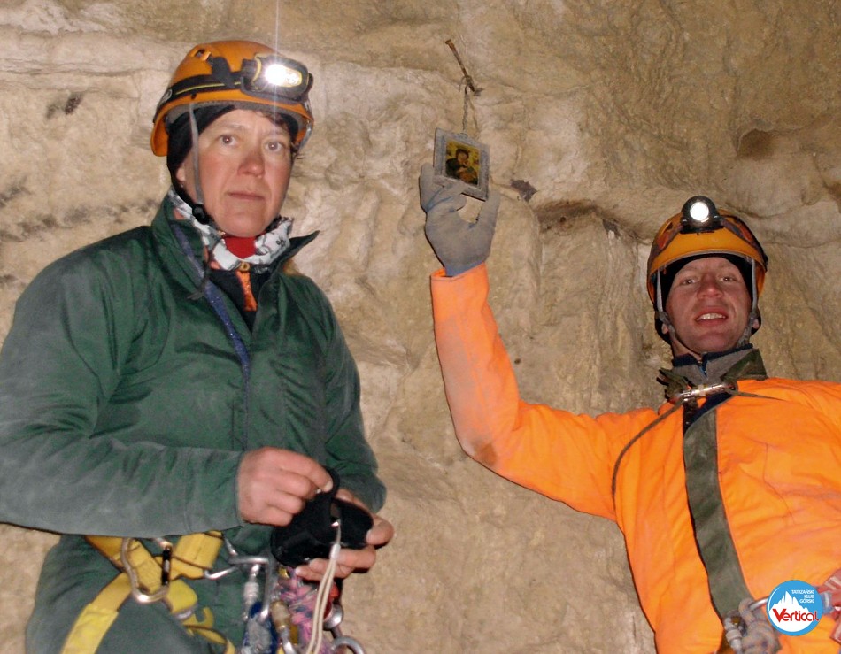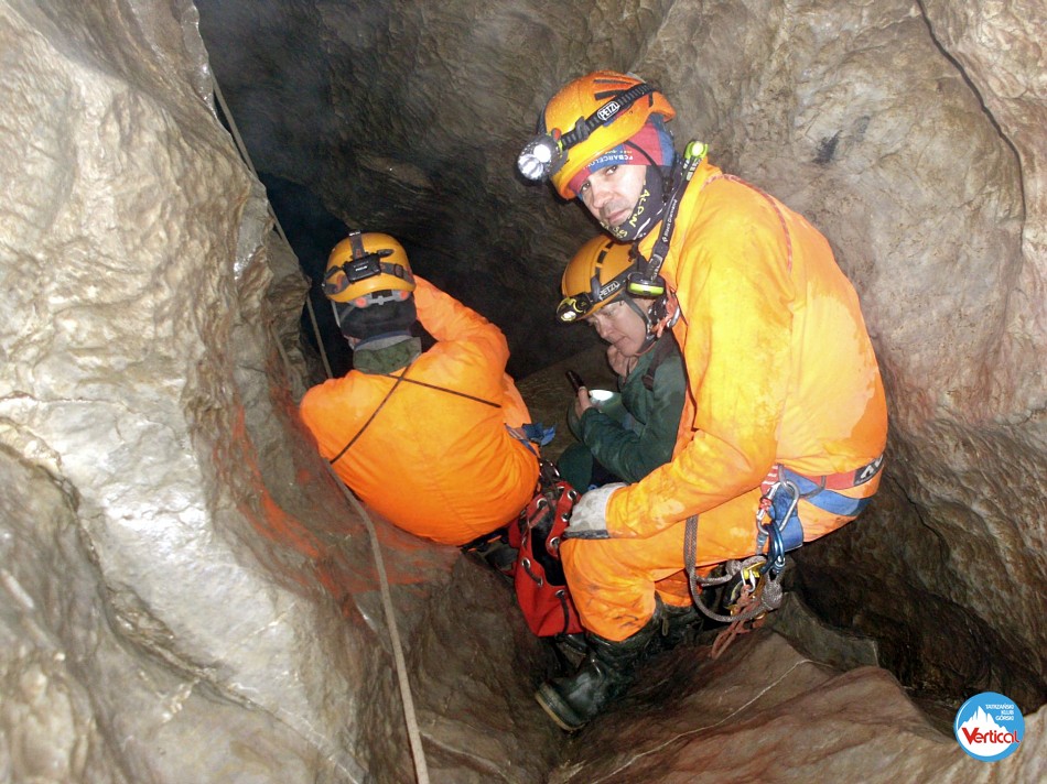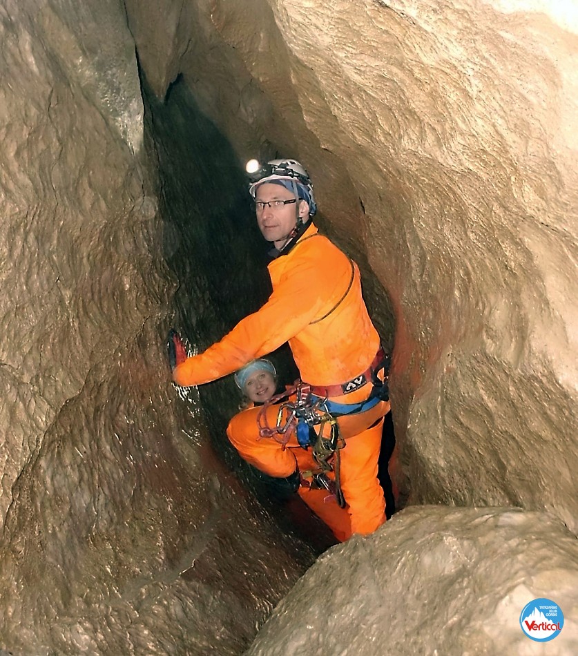 Ciasny Korytarzyk zachęcał wylodzonym dnem do zjazdu na tyłkach, a jaskinia okazała się w środku wyjątkowo sucha. Kałuża przed Salą Bez Stropu prawie "wyschła", no i w Wielkich Kominach, zazwyczaj obfitujących w prysznice było względnie sucho. Zjechaliśmy do syfonu w składzie: Zosia Bachleda, Kaśka Burdzy, Marzena Migas, Maciek Gąsienica Makowski, Witek Rasztabiga, Adaś Wojdyła i Grzesiek Albrzykowski (foto)