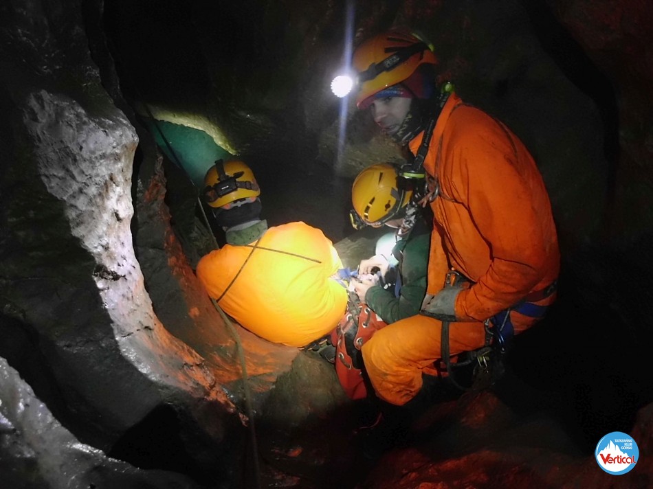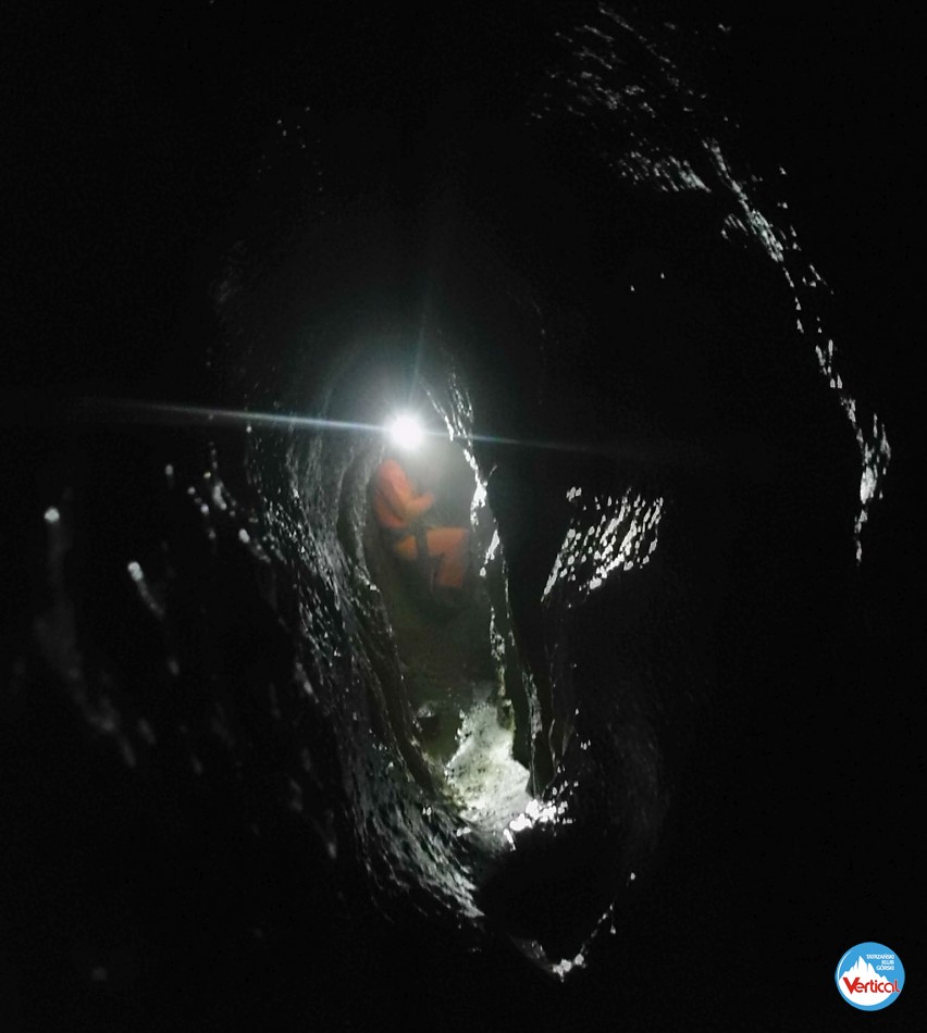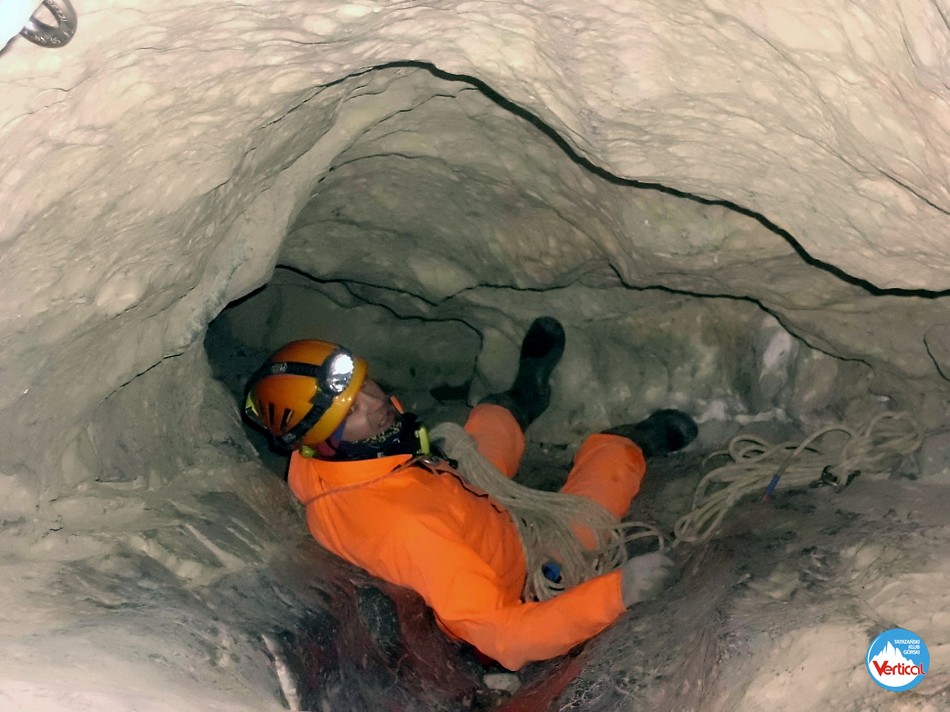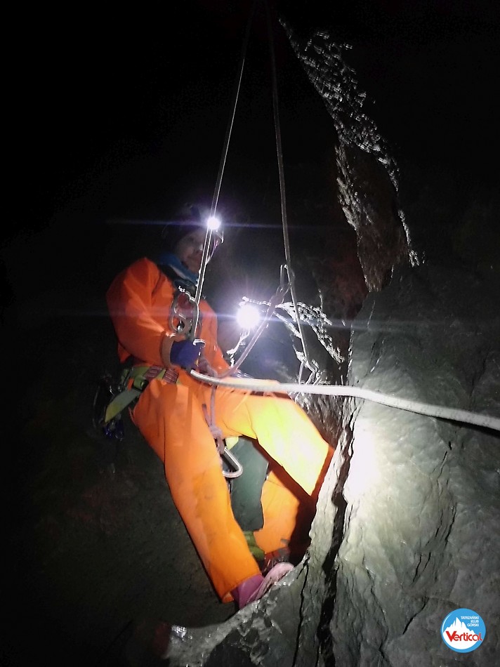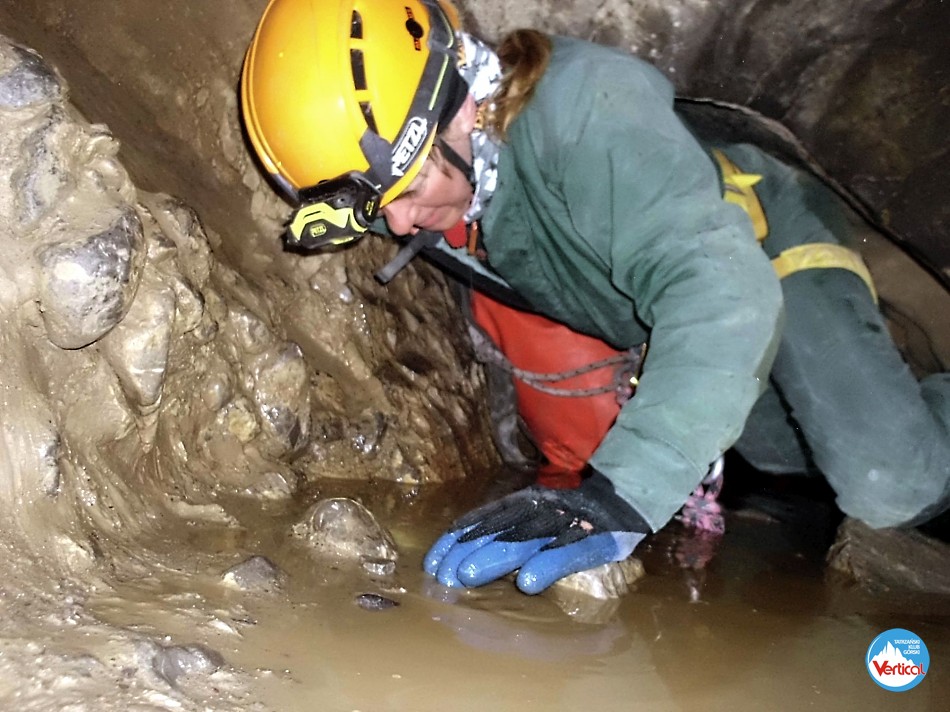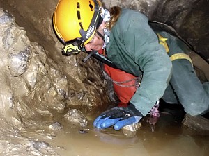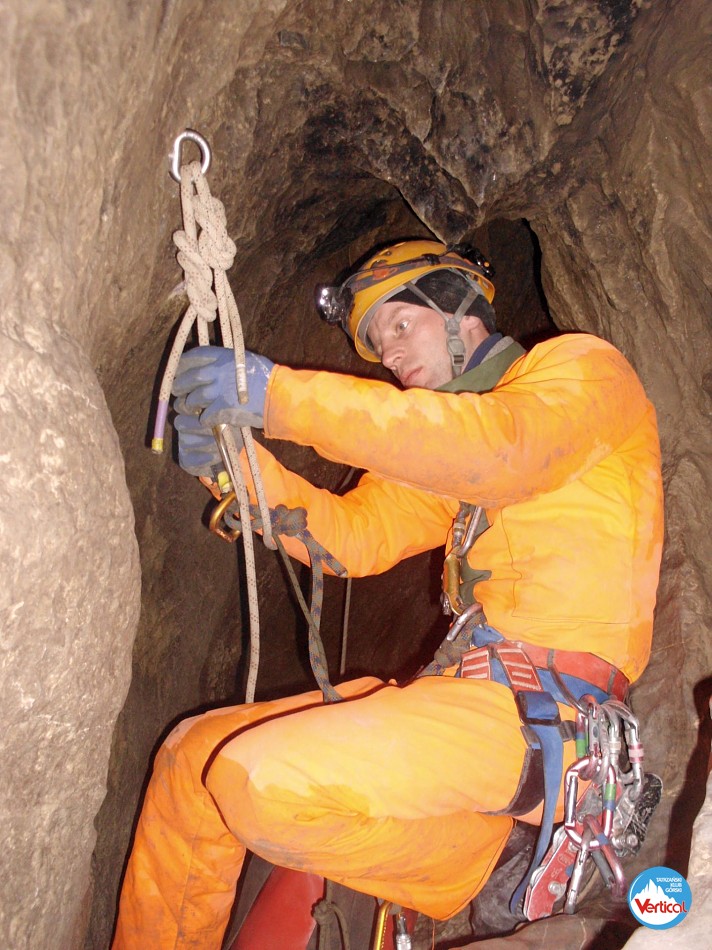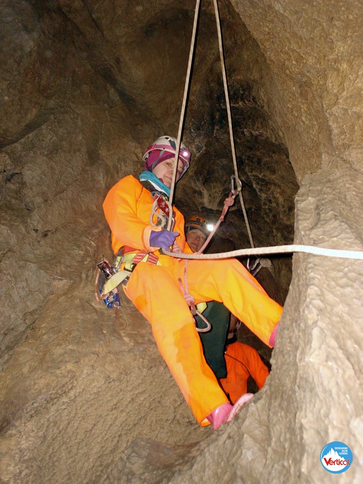 Ciasny Korytarzyk zachęcał wylodzonym dnem do zjazdu na tyłkach, a jaskinia okazała się w środku wyjątkowo sucha. Kałuża przed Salą Bez Stropu prawie "wyschła", no i w Wielkich Kominach, zazwyczaj obfitujących w prysznice było względnie sucho. Zjechaliśmy do syfonu w składzie: Zosia Bachleda, Kaśka Burdzy, Marzena Migas, Maciek Gąsienica Makowski, Witek Rasztabiga, Adaś Wojdyła i Grzesiek Albrzykowski (foto)