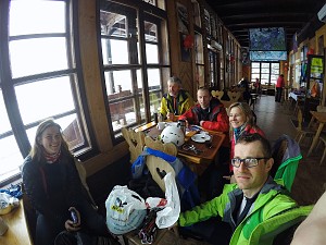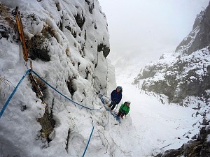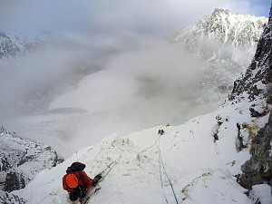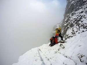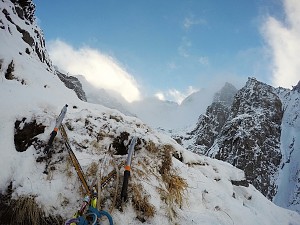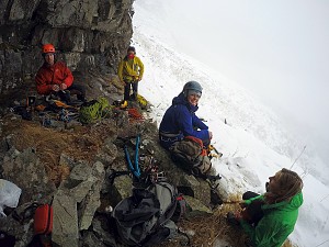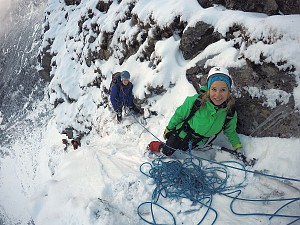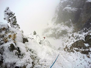 Wspólnie pokonaliśmy dwie drogi - Żlebem oraz Żebrem. W górnej części połączyliśmy siły by pokonać niełatwy kominek i wejść dumnie do Bandziocha. Szczególne brawa dla Basi i Magdy, które pierwszy raz wspinały się zimowo. W sumie była nas piątka - jeszcze Adaś, Bogdan i Paweł.