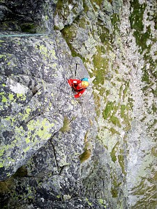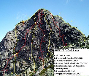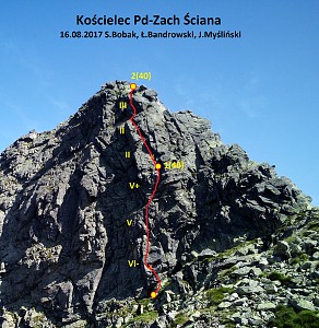 "SYKOWNY FILAREK" Kościelec płd.-zach. ściana. 16-08-2017 Trudności VI-,2 wyciągi. Myśliński Jędrek, Bandrowski Łukasz, Bobak Stanisław. Droga prowadzi filarkiem między "Depresją Dziędzielewiczów", a drogą "Grzegorczyk-Jarocka"