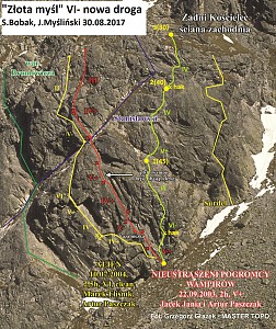 "ZŁOTA MYŚL" Zadni Kościelec zach. ściana. 30-08-2017 Trudności VI-,3 wyciągi. Myśliński Jędrek, Bobak Stanisław. Droga startuje na lewo od drogi "Kacperek-Stawarz". Dalej przecina ją oraz drogę "Roboty drogowe" (niezaznaczone na topo) i idzie na prawo od "Stanisławskiego".