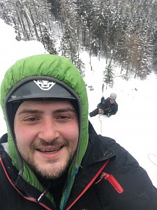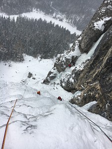 Na niedzielę przewidzieliśmy Adin Úsmev (WI3) dolny wyciąg „dziurawy” stopnie i „chwyty” pod dziaby .. górny wyciąg na przełamaniu polewka mocno przemrożona. Przed nami 4 zespoły co chwile leciały z góry „tablety i kowadła”, temp dość przyjemna -16 :)