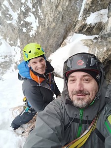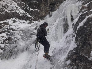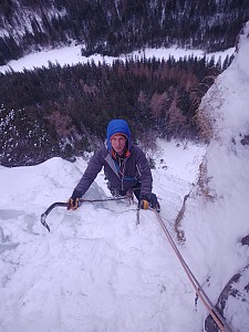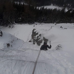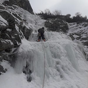 W tym czasie, gdy się wspinam dwa zespoły już rozpoczęły zjazd po zrobieniu drogi, więc czekam, aż przejadą obok mnie, po czym szybko dochodzę do Zbyszka i kolej na zmianę. Teraz moja kolej. Stanowisko było z ringa i plakietki, więc pierwsze metry szedłem dziarsko, ale z każdym krokiem wyżej i z każdym uderzeniem czekana, ubywało mi animuszu. Co jakiś czas wkręcam oczywiście śrubę lodową która lekko podbudowuje mi psychiką. Zespół trzy osobowy zbudował stanowisko ze śrub lodowych, niestety obok nich nie ma miejsca żebym pewnie stanął i zrobił swoje stanowisko więc postanawiam iść troszkę wyże, gdzie jest stanowisko z plakietek w skale, niestety do tego miejsca prowadzi droga przez śnieg i nie ma gdzie osadzić śruby. Z pomocą przychodzi mi jeden towarzysz z zespołu, który mijam. Jak później się dowiedziałem miał na imię Dawid. Dawid zasugerował, że wkręci mi śrubę i wepniemy ekspres górski. Podałem mu śrubę i zrobiliśmy, jak powiedział. Poziom komfortu psychicznego poszybował w górę, a ja wraz z nim dotarłem do stanowiska. Wpinam się, wybieram linę, zakładam asekuracje dla Zbyszka i daje mu zielone światło do drogi. Po kilku minutach jest przy mnie. Pytam go czy idzie kolejny wyciąg, już ostatni, czy ja mam iść? Mówi, że może iść. Ponawiam pytanie i pada decyzja, że on idzie. Ruszył, w teorii w najtrudniejszy wyciąg. Szło mu sprawnie, chociaż wyczuć można było lekki stres, jak szukał miejsca na wkręcenie śrub, który znikał zaraz po ich osadzeniu. Powoli dotarł do kluczowego miejsca. Akurat w czasie, gdy trójkowy zespół zaczął zjeżdżać, więc wkręcił śrubę, wpiął się i znalazł dla siebie wygodną pozycję, gdy pierwszy zawodnik przejechał przystąpił do ataku. Lód w tym miejscu był niewdzięczny, każdy cios czekanem odłupywał bryły lodu. Czekan, poprawka, czekan, poprawka, rak, poprawka, rak poprawka. Kilka razy tak powtórzona sekwencja i udaje mu się pokonać najtrudniejszy moment. Dociera do stanowiska. I teraz moja kolej. Ze spokojną głową pokonuje po nim drogę, bez ryzyka lotu i podziwiam chłopa za psychikę. Pozostało zjechać i wrócić do samochodu. W taki od to sposób przełamaliśmy ze Zbyszkiem pierwsze lody PS. Okazało się, że to nie koniec przygody, w drodze powrotnej awarii uległ samochód, na szczęście Prezes nie w ciemię bity i szybko ją naprawił