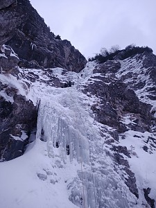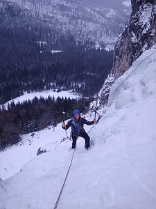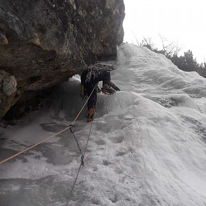 Celem podróży były Lodospady w Dolinie Białej Wody. W związku z tym, że nasze doświadczenie w tej dziedzinie wspinaczki było i nadal jest niewielkie, postanowiliśmy wstawić się łatwy lodospad, wybór padł na Lodospad Kaskady (WI3+/II). W drodze na Kaskady spotkaliśmy dwa zespoły dwuosobowe udające się na ten sam lodospad, a u jego podnóża okazało się, że był tam jeszcze zespół trzy osobowy. Spowodowało to, że temperatura, którą zdążyliśmy nabrać podczas podejścia, spadła podczas oczekiwania na swoją kolej. Wspinaczkę zaczęliśmy jako ostatni zespół. Trafił mi się zaszczyt poprowadzenie pierwszego wyciągu. Ruszyłem za zespołem trzyosobowym, który ulokował się na stanowisku, jakieś 30m od startu. Pomimo obaw i niepewności co do nowej formy wspinania udało mi się sprawnie dotrzeć do stanowiska, przy którym musiałem odczekać swoje zanim się zwolniło. Na szczęście towarzystwo w stanowisku było wesołe, więc czas się nie dłużył. Założyłem taśmę na małą kolumienkę dla komfortu psychicznego i czekaliśmy, aż ich partner poprowadzi wyciąg. Niestety wyższe stanowisko było także zajęte przez poprzedni zespół więc on też musiał odczekać swoje. Żal mi było tylko Zbyszka, który marznął na dole, asekurując mnie i czekając w samotności, aż będzie mu dane się wspinać. Na szczęście po kilkunastu minutach wszystko się ruszyło, dwójka towarzysz ze stanowiska w końcu ruszyła, ja zbudowałem swoje stanowisko i Zbyszek już mógł gnać do góry. Szybko i sprawnie do mnie dotarł. Chyba na prawdę zmarznął tam na dole, bo bez dłuższego gadania, pobrał odemnie sprzęt potrzebny do dalszej wspinaczki i pognał poprowadzić kolejny wyciąg. Chociaż już nie tak pewnie jak na drugiego, aczkolwiek dość sprawnie. W między czasie nad naszymi głowami i obok nas latały odłamki lodów, odłupywane przez zespoły nad nami. -Mam auto- słyszę z góry. -Nie asekuruje – odpowiadam i przygotowuje się do wspinaczki. Ten wyciąg też był krótki wiec czekam aż Zbyszek wybierze linę i da komendę, że mogę iść. -Możesz iść- krzyczy. Demontuję stanowisko i idę. Uwielbiam iść na drugiego, pełen luz psychiczny, kwintesencja wspinania